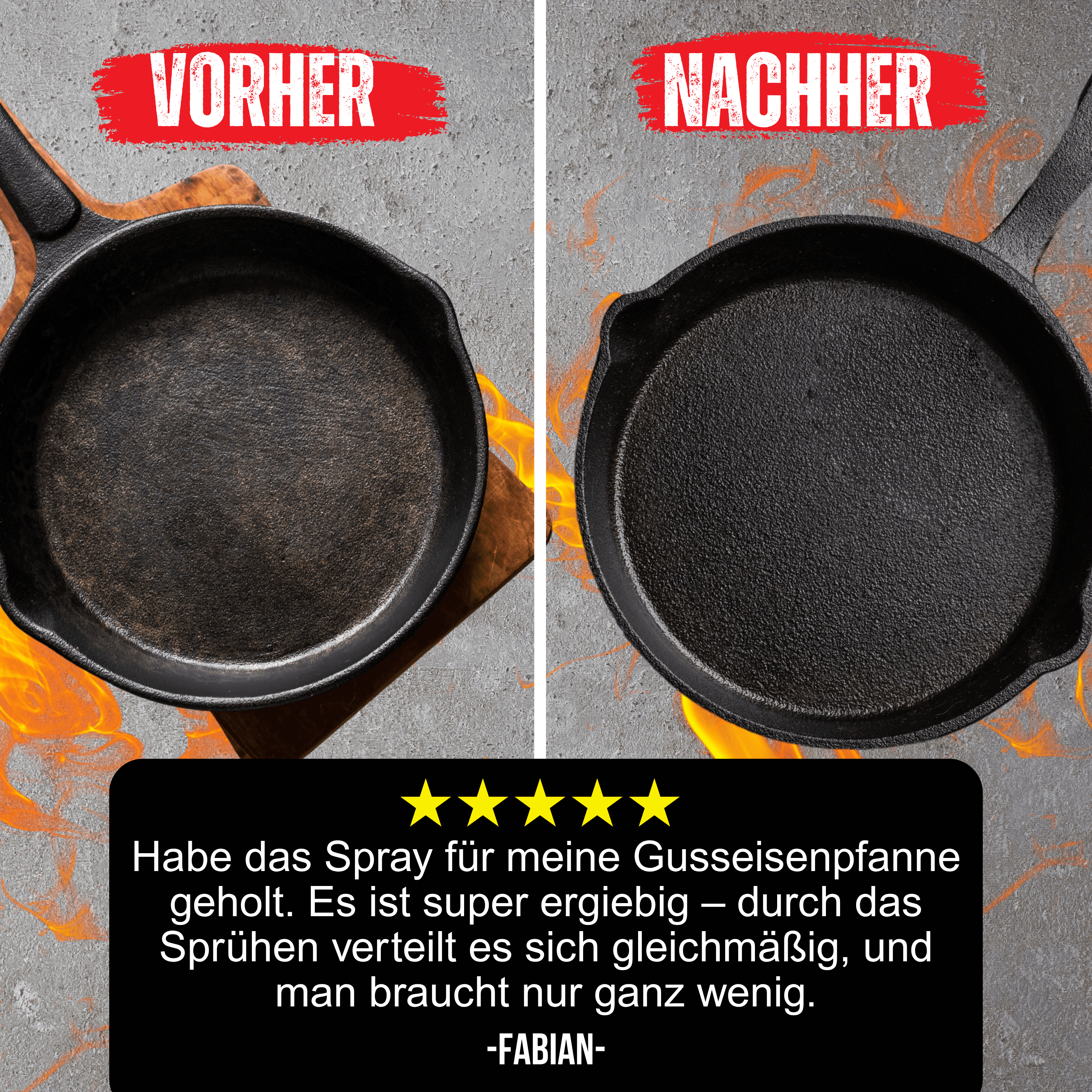 Schutz vor Rost und Korrosion: Gerade bei Gusseisen und Stahl ist der Schutz vor Witterung und Feuchtigkeit entscheidend. Das Gusseisen Pflegespray bildet eine unsichtbare Schutzschicht, die deinen Grill und das Zubehör vor Rost bewahrt. Selbst bei häufigem Gebrauch im Freien bleibt dein Equipment dauerhaft geschützt und einsatzbereit.